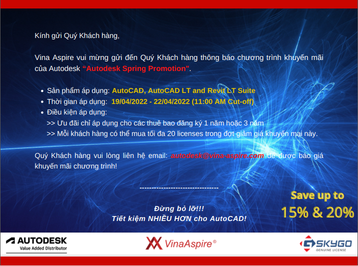 “Autodesk Spring Promotion” tại Vina Aspire Khuyến mãi liên quan Xem thêm Chương trình ưu đãi Autodesk Accelerator – Giảm 16.67% cho thuê bao phần mềm bản quyền Từ 6/4/2025 11:23:00 AM ~ 7/25/2025 11:23:00 AM AutoCAD LT & IST – Thiết kế 2D nhanh, chuẩn xác – Giảm ngay 10% cho khách hàng mới Từ 6/4/2025 11:56:00 AM ~ 6/4/2025 11:56:00 AM Chương trình Khuyến mãi Autodesk “Cyber Week” | 02 – 06/12/2024 Từ 12/2/2024 12:00:00 PM ~ 12/6/2024 12:00:00 PM Ưu đãi đặc biệt cho các giải pháp Chuyên ngành - Khởi đầu sáng tạo cùng Autodesk Từ 11/1/2024 12:00:00 PM ~ 12/31/2024 12:00:00 PM Ưu đãi đặc biệt - Tăng tốc sáng tạo cùng Autodesk 3Ds Max Từ 11/1/2024 12:00:00 PM ~ 12/31/2024 12:00:00 PM Thông báo: Chương trình khuyến mãi AutoCAD Volume Territory - Cơ hội sở hữu AutoCAD LT và IST với ưu đãi đặc biệt Từ 9/4/2024 12:00:00 PM ~ 9/29/2024 12:00:00 PM Thông báo: Chương trình khuyến mãi 3Ds Max - Ưu đãi đặc biệt tối ưu sáng tạo cùng Autodesk | 12/08/2024 – 31/10/2024 Từ 8/12/2024 12:00:00 PM ~ 10/31/2024 12:00:00 PM Chương trình khuyến mãi Autodesk “Tri ân Khách hàng” | 12/08 – 31/10/2024 Từ 8/12/2024 12:00:00 PM ~ 10/31/2024 12:00:00 PM Chương trình khuyến mãi “Autodesk Appreciation Week” | 27 – 31/05/2024 Từ 5/27/2024 12:00:00 PM ~ 5/31/2024 12:00:00 PM Chương trình Khuyến mãi Autodesk “Mini Flash Sales” | 08 – 29/04/2024 Từ 4/8/2024 12:00:00 PM ~ 4/29/2024 12:00:00 PM Giảm giá lớn cho “Microsoft Defender For Business” và “Office 365 E1” cùng Gskygo Từ 3/7/2024 12:00:00 PM ~ 7/1/2024 12:00:00 PM Chương trình Khuyến mãi Autodesk “Flash Promo” | 16 – 19/01/2024 Từ 1/16/2024 9:00:00 AM ~ 1/19/2024 12:00:00 PM